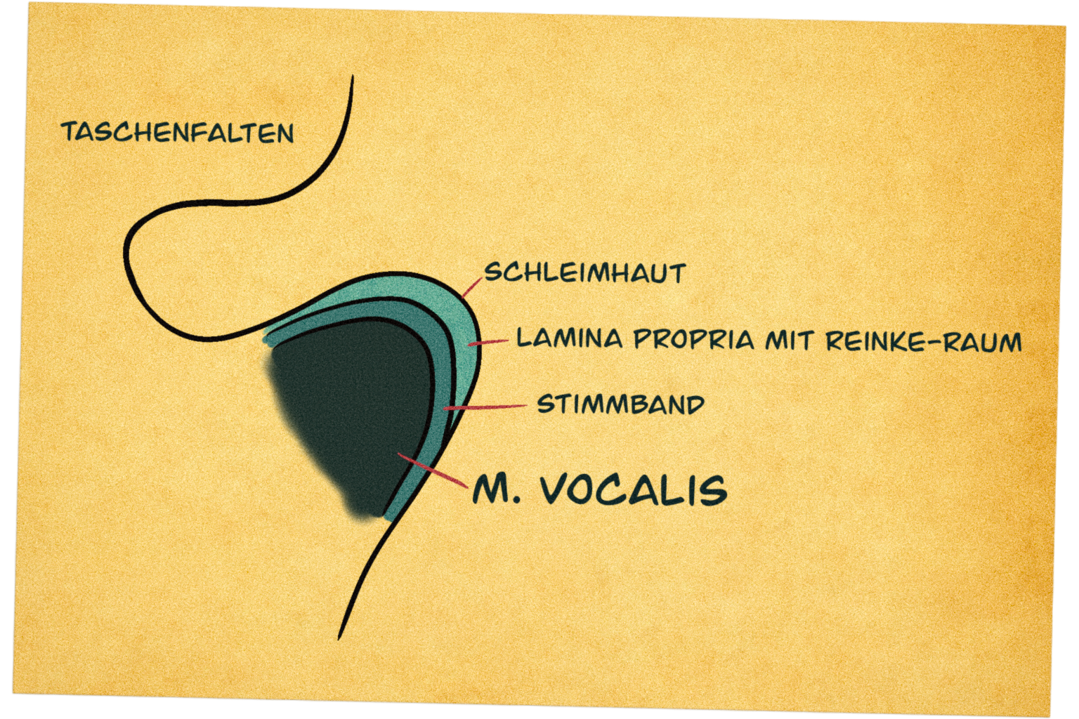 - Lamina propria – sie besteht aus mehreren Lagen. Außen weich und gelartig (inklusive Reinke-Raum), innen zunehmend fester. Hier liegt auch das Stimmband, eine faserige Verbindungsschicht mit strukturgebender Funktion